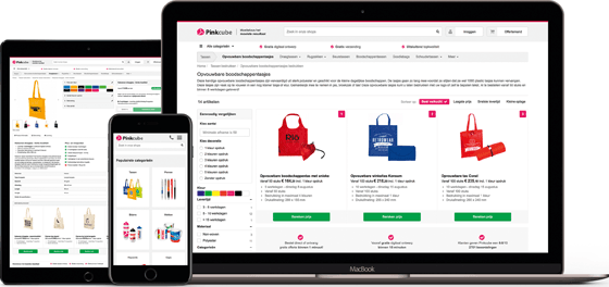 State of the art shop“Moeiteloos het mooiste resultaat” – “effortlessly the best result”: The slogan that was introduced in 2016 epitomises the company’s strategy. Because Pinkcube offers a shop model that allows the customer to not only order individualised haptic advertising messengers in just a few clicks, he also receives information on the products and warehouse stocks as well as the delivery status reports in real-time. In short: Exactly the same services are provided that the online giants like Amazon or Zalando demonstrated as role models. Pinkcube combines this B2C-style shopping experience with a web-to-print mechanism, including digital samples and pre-press. This is made possible by an architecture that seamlessly links the web shop to the own CRM and to the systems of the supplier partners. “We are one of the fastest in the industry, because we develop and manage everything ourselves,” explained Bas Prinsen, Team Leader Development. “It wouldn’t work for us to fall back on external software, because we wouldn’t be able to obtain anywhere near the same quality. So far, we have made more than 10,000 improvements to the web shop, the development is an ongoing process.” Of course, the customers only see the user interface and here Pinkcube invests a lot of time and expense in order to guarantee the highest level of user-friendliness possible. “We only call up the article numbers, prices and product data from the suppliers, we generate the photos and texts ourselves,” commented Ronald Cuperus, Team Leader Online Marketing. “In addition to the photos we also post video loops on the products, furthermore the customer can compare the advantages and disadvantages of different articles using a comparison tool. Since 2015, our design has been completely responsive, because in the meantime around one fifth of the orders are transacted from a mobile end device.”