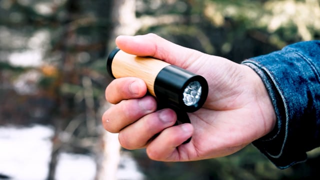 Pocketformaat zaklamp gemaakt van FSC® 100% bamboe en RCS (Recycled Claim Standard) gecertificeerd gerecycled ABS. Totale gerecyclede inhoud: 23% op basis van het totale gewicht van het item. RCS-certificering garandeert een volledig gecertificeerde toeleveringsketen van gerecyclede materialen. De bundelafstand is 20 meter en levert 30 lumen. Verpakt in FSC® mix kraft verpakking. Het artikel en de accessoires zijn 100% PVC-vrij. Inclusief batterijen