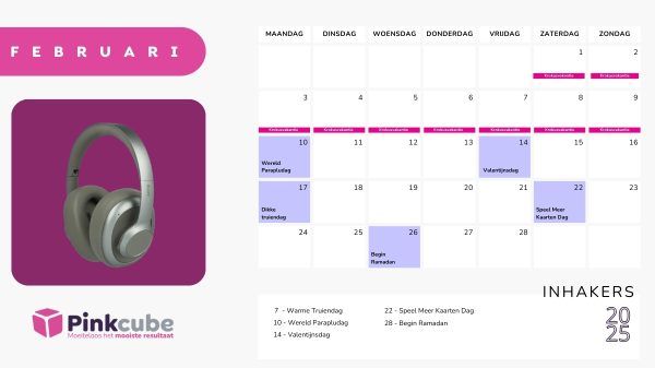 Pasen, Tomorrowland, het Weekend van de Klant en ga zo maar door - staat jouw merk al klaar om in te haken? Met de Pinkcube inhaakkalender 2025 van België heb jij elk inhaakmoment binnen handbereik. Deze gratis kalender download je in één klik als PDF of gemakkelijk in je digitale agenda, zodat jij altijd klaarstaat om op tijd én verrassend uit de hoek te komen.